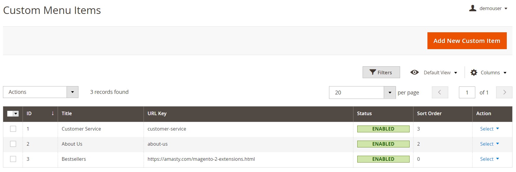 The Magento 2 Mega Menu extension gathers all elements of your mega menu in a grid under Content → Amasty Mega Menu → Custom Menu Items. The grid shows each item’s ID, title, URL key, and status (enabled or disabled). You can edit or delete each menu item from the Action column, as well as delete elements in bulk via mass actions. The “Add New Custom Item” button lets you add new items to the menu.