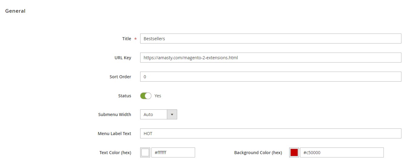 In the General settings, create a title of a new item, specify a URL link for redirect (can be a custom URL or CMS page), and select a status (disabled, enabled for mobile only, enabled for desktop only, or enabled for both mobile and desktop). Here, you also choose a submenu width (Full Width, Auto, or Custom), type in a text for the menu label, and specify colors for the text and background.