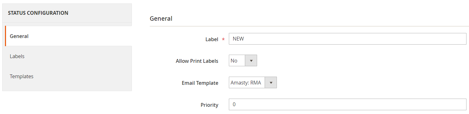 Under the General tab, you enable/disable the status, create its name, and select an appropriate request state that will be displayed on the frontend (Processing, Approved, Delivered, Completed, or Canceled). Next, you can set the configured status as initial so that all new return requests will get this status after submission. Here, you can also choose an event that will assign the configured status to an RMA request and decide to which grid requests with this status should be moved. Besides, you can select a label color and set the position of the status to define its priority.