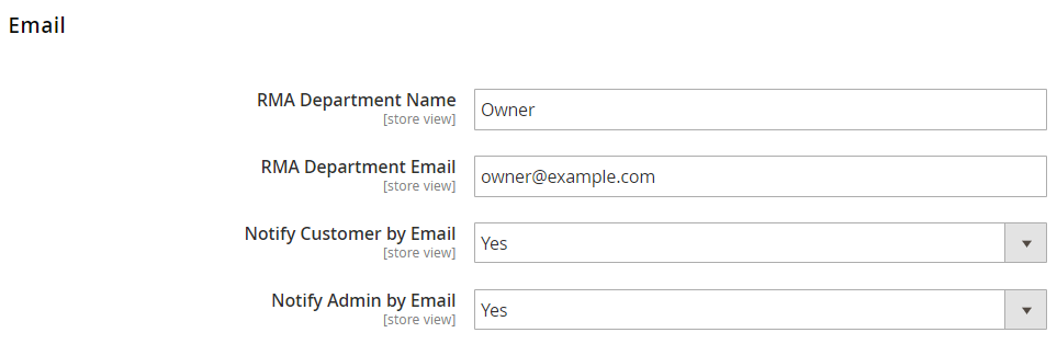 The RMA Policy tab consists of just two fields: Enable Return Policy (Yes/No) and Return Policy CMS Page (select a corresponding CMS page to redirect customers).