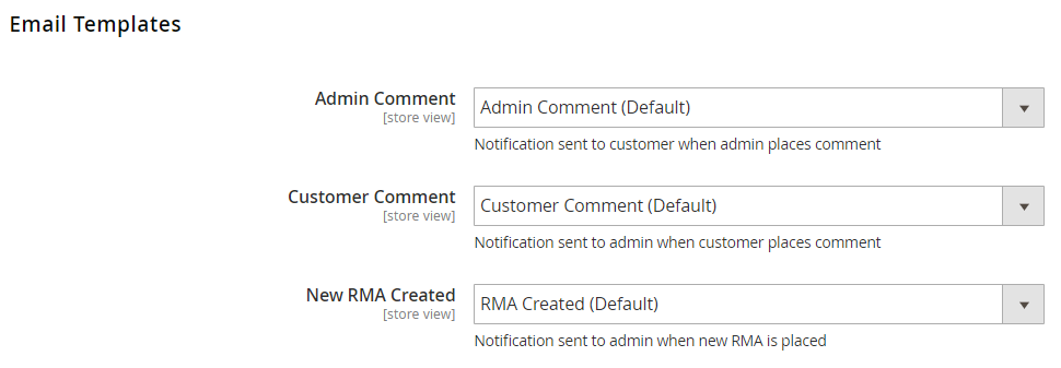 In the following settings section, you can enable/disable email notifications sent to customers and admins, choose appropriate email senders and templates, and specify the email addresses of recipients of admin email alerts.