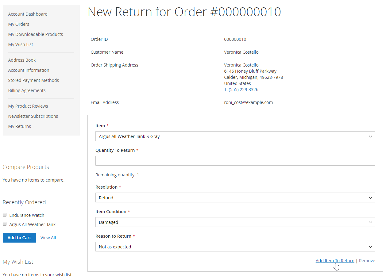 The procedure for logged in customers is very straightforward. In the My Returns tab of a customer account, first, a customer selects an order for which they want to submit a return request.