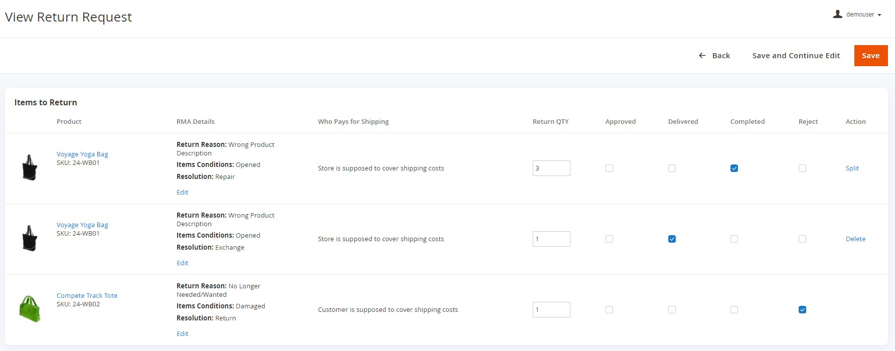 The Items to Return section shows the following details: a product name, SKU, a reason to return, items condition, resolution, who pays for shipping, quantity to return, and status (Approved, Delivered, Completed, or Reject).