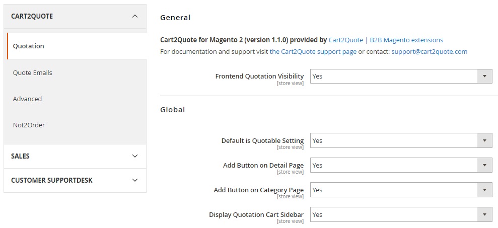 The extension settings are divided into 5 tabs: Quotation, PDF Print-outs, Quote Email, Advanced, and Form Builder. The Quotation tab is divided into three sections: General, Global, and Proposal. The Global tab allows you to enable/disable the Cart2Quote Magento 2 extension on the frontend, make products quotable by default, add the “Request Quotation” button on detail and category pages. Here, it is also possible to activate dynamic add to cart/quotation buttons and mini quote view, as well as set the default expiration and reminder dates for a quote.
