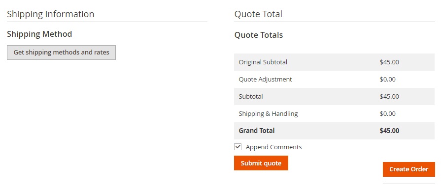 In the last section, you can change shipping methods and refresh shipping rates. Besides, Quote Totals not only shows original subtotal, quote adjustment, subtotal, shipping & handling, and grand total, it also provides the ability to submit the quote and preview the quote PDF, as well as create an order.