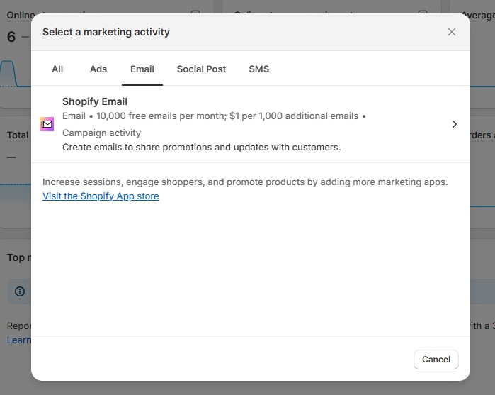A Shopify interface screenshot showing the "Select a marketing activity" menu, highlighting Shopify Email’s free email allowance and campaign creation options necessary when you figure out How to Dropship on Shopify