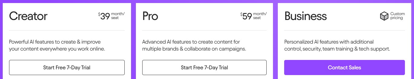 Jasper AI pricing starts at $39/month per user for the Creator plan and goes up to $59/month per user for the Pro plan. Enterprise users can choose a Business plan with custom pricing tailored to their needs. A free 7-day trial is also available to test the platform.