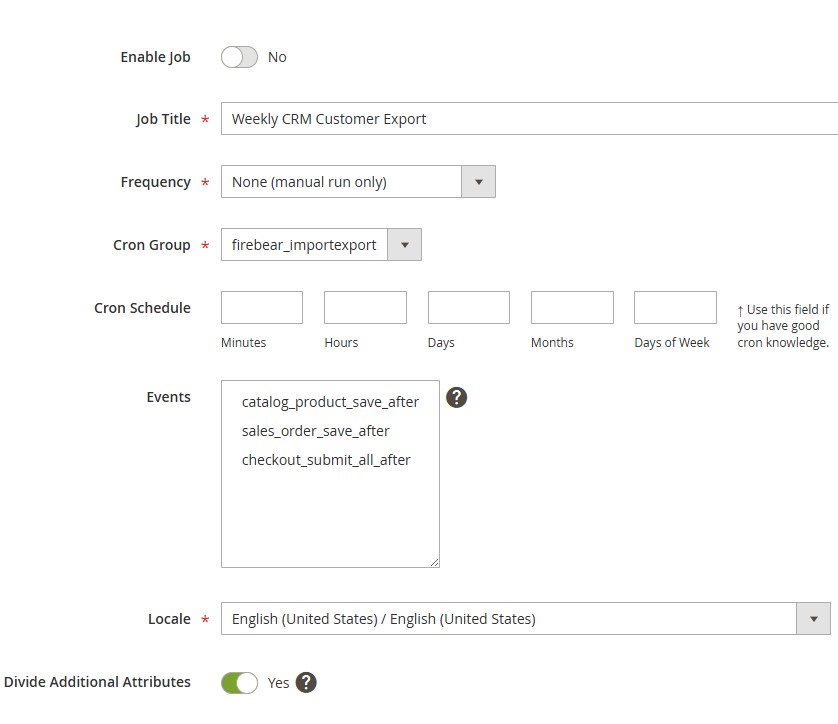 - Schedule the export: Set a cron job for automatic execution if applicable. Alternatively, you can choose events to trigger your customer export from Magento 2.