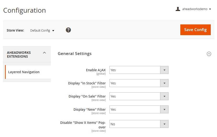 Aheadworks Layered Navigation has a more intuitive administrative interface with less complicated settings. In General Settings you can: enable/disable AJAX (enable it!); activate three new filters (the mentioned before In Stock, On Sale, and New); show/hide “Show X Items” popover; configure price filter options; choose default filter state; set the limit for filter values display; hide/show unavailable filters; hide/show unavailable attribute values.