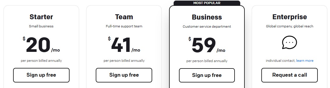 LiveChat pricing starts at $20 per month per user (billed annually) for the Starter plan. The Team plan costs $41, the Business plan is $59, and the Enterprise plan offers custom pricing with additional services and compliance options.
