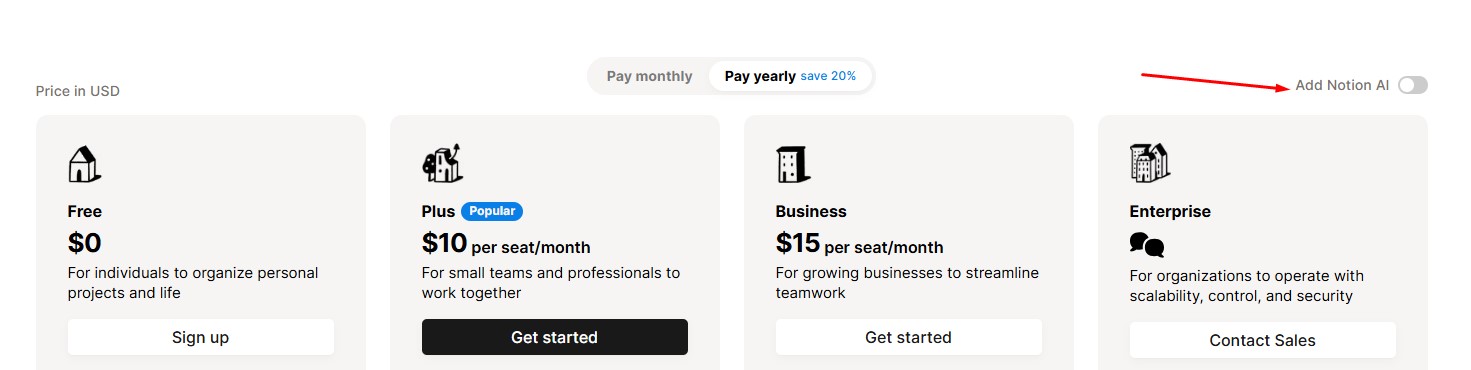 Notion AI is not bundled with this plan. If you want AI-powered content creation, summarization, or database enhancements, you must add Notion AI separately at an additional cost per user.