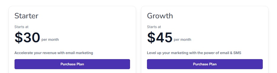 Starting at $45 per month, the Growth Plan builds on everything offered in the Starter tier and introduces SMS marketing as a second powerful channel. With this plan, you can send time-sensitive texts, abandoned cart reminders, promotional campaigns, and welcome messages via SMS — all automated and fully integrated with your customer journey. The plan starts with 75 SMS contacts and up to 450 sends per month, specifically targeting U.S. and Canadian customers.
